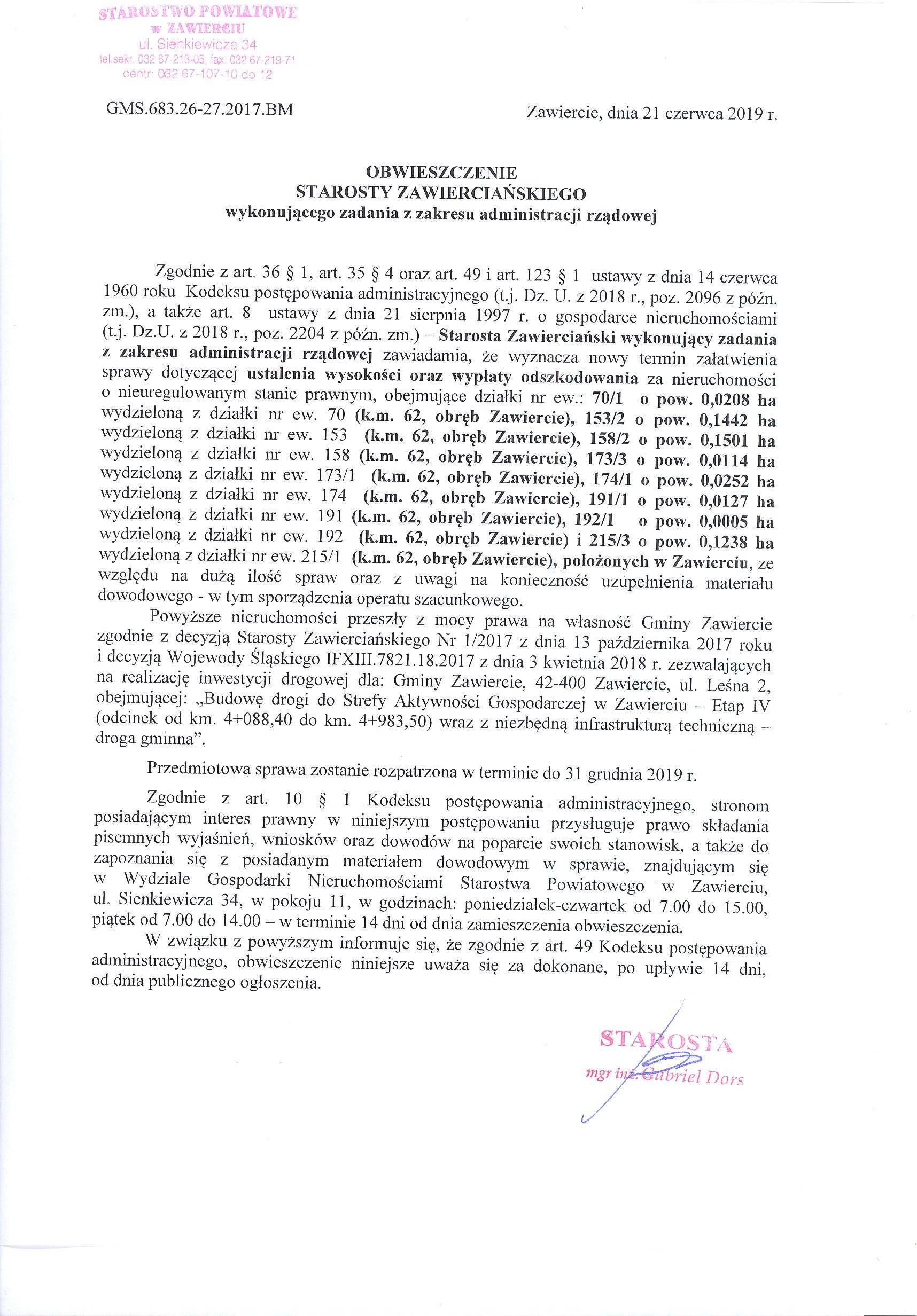Obwieszczenie Starosty Zawierciańskiego wykonującego zadania z zakresu administracji rządowej wyznaczające nowy termin załatwienia sprawy dot. ustalenia wysokości i wypłaty odszkodowania za nieruchomość o nieuregulowanym stanie prawnym obejmującą działki nr ew.: 70/1, 153/2, 158/2, 173/3, 174/1, 191/1, 192/1 i 251/3 (k.m. 62, obr. Zawiercie), położoną w Zawierciu