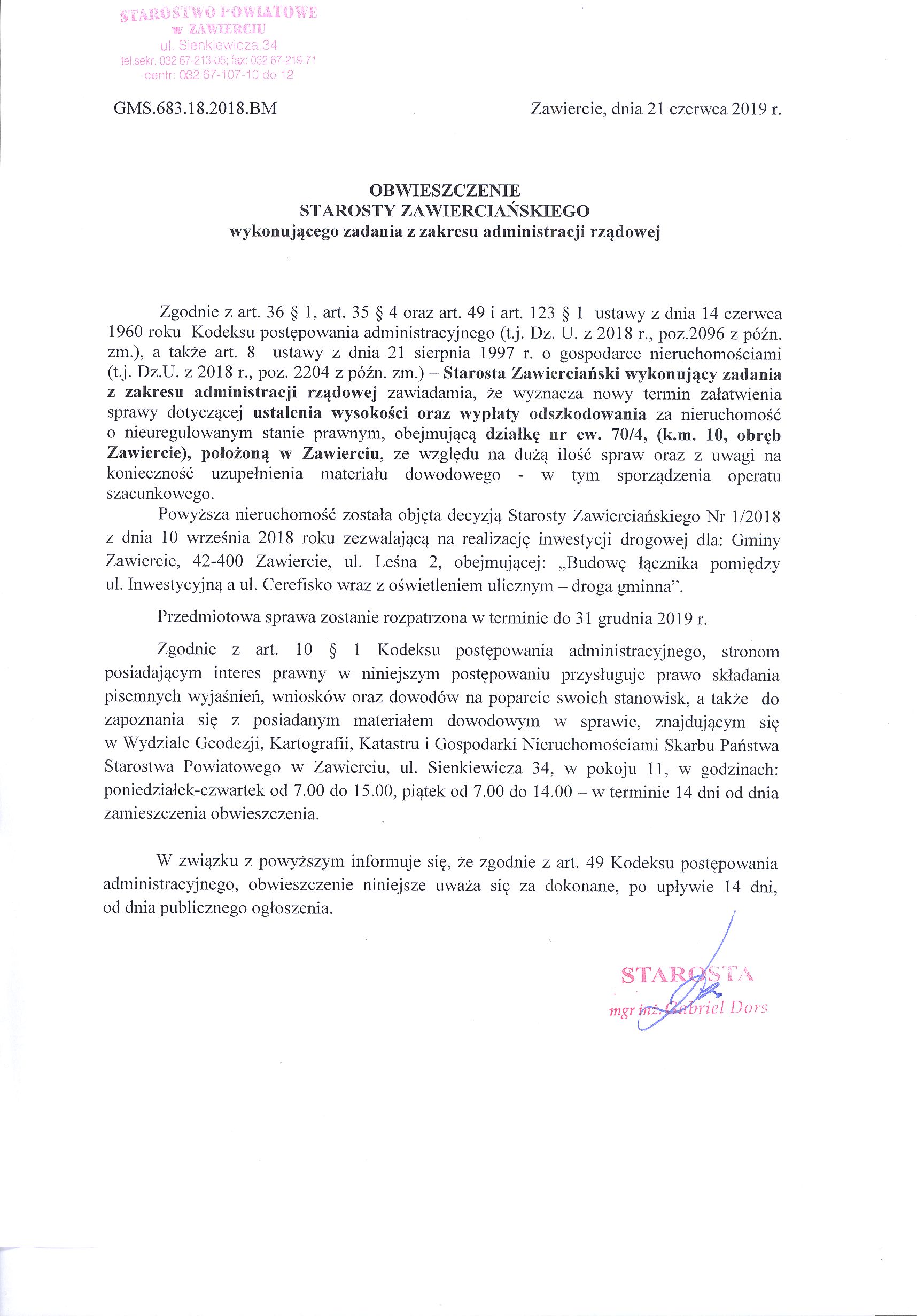 Obwieszczenie Starosty Zawierciańskiego wykonującego zadania z zakresu administracji rządowej wyznaczające nowy termin załatwienia sprawy dot. ustalenia wysokości i wypłaty odszkodowania za nieruchomość o nieuregulowanym stanie prawnym obejmującą działkę nr ew. 70/4 (k.m. 10, obr. Zawiercie), położoną w Zawierciu