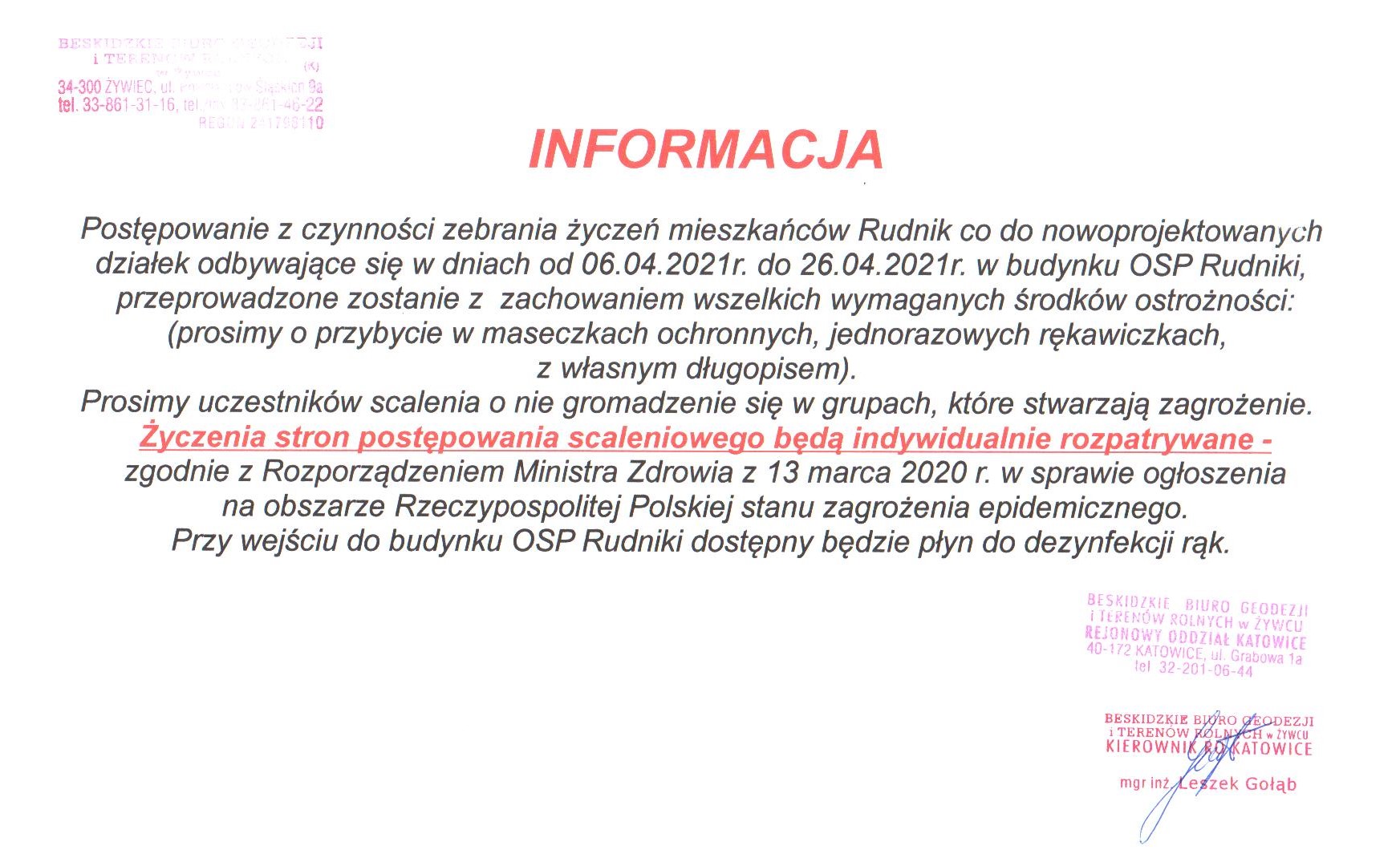 IINFORMACJA .Postępowanie z czynności zebrania życzeń mieszkańców RUdnik co do nowoprojektowanych działek odbędzie się w dniach od 06.04.2021 r. do 26.04.2021 r.w budynku OSP Rudniki,przeprowadzone zostanie z zachowaniem wszelkich wymaganych środków ostrożności :(prosimy o przybycie w maseczkach ochronnych,jednorazowych rękawiczkach,z własnym długopisem).Prosimy uczestników scalenia o nie gromadzenie się w grupach,które stwarzają zagrożenie.Życzenia stron będą postępowania scaleniowego indywidualnie będą rozpatrywane.Przy wejściudo budynku OSP Rudniki dostępny płyn do dezynfekcji rąk.