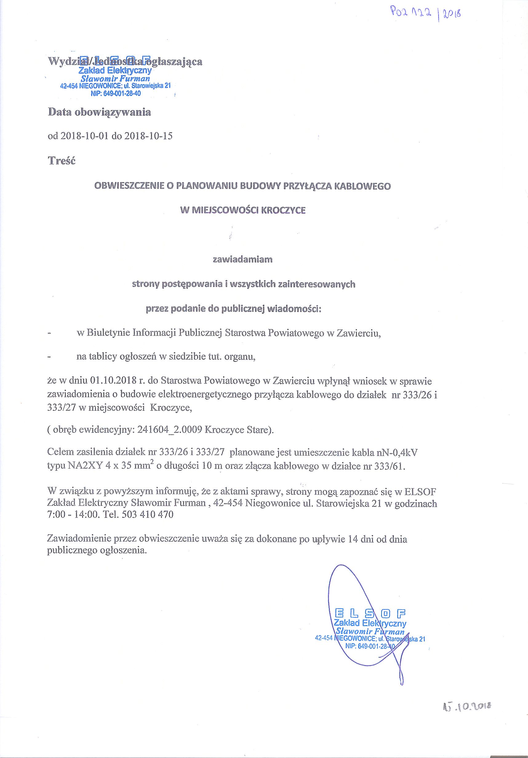 Obwieszczenie o planowaniu budowy przyłącza kablowego w Kroczycach