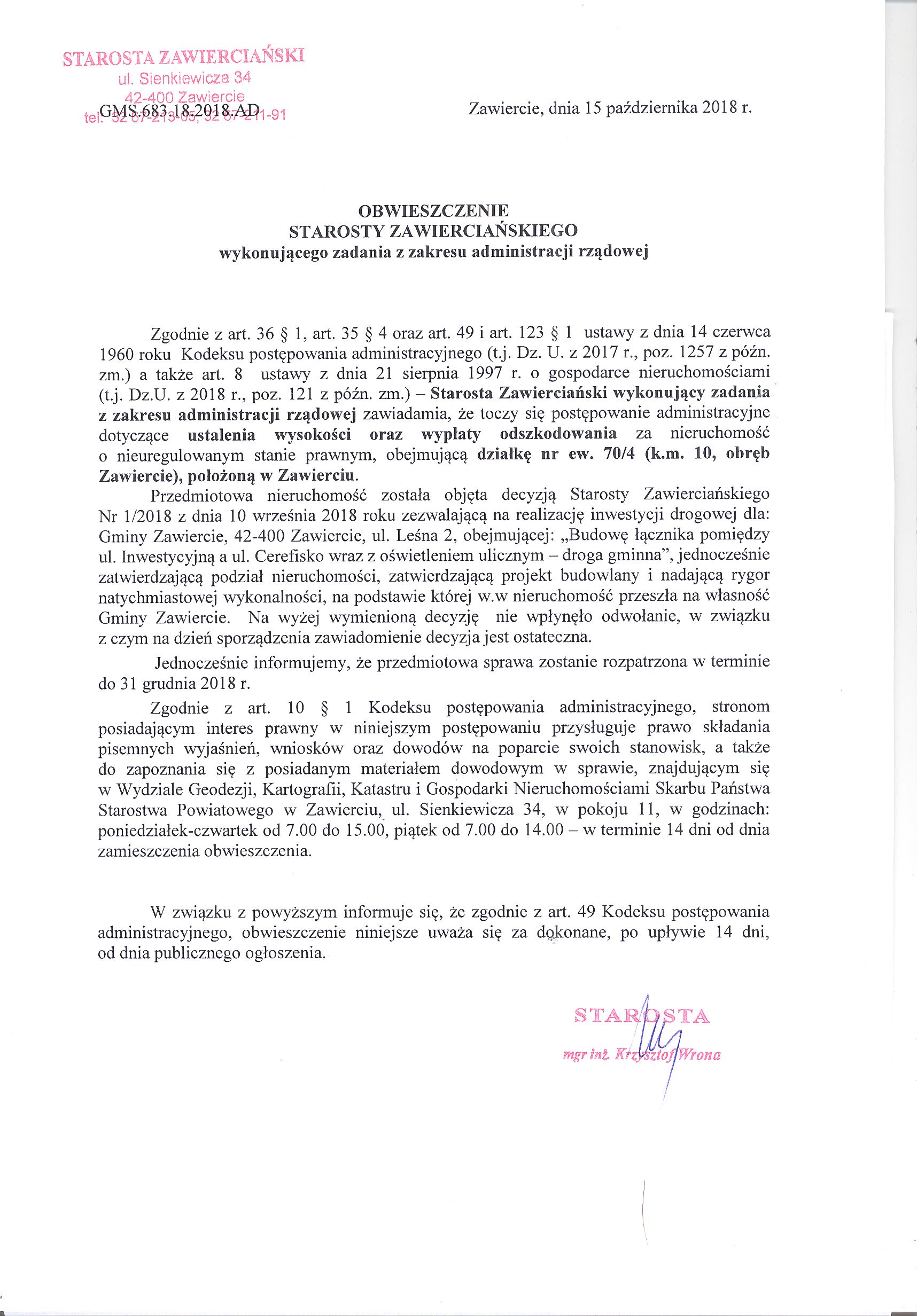 Obwieszczenie Starosty Zawierciańskiego w sprawie wszczęcia z urzędu postępowania administracyjnego dot. ustalenia wysokości oraz wypłaty odszkodowania za nieruchomość o nieuregulowanym stanie prawnym, obejmującą działkę nr ew. 70/4 (k.m. 10, obręb Zawiercie), położoną w Zawierciu, zajętą pod drogę publiczną