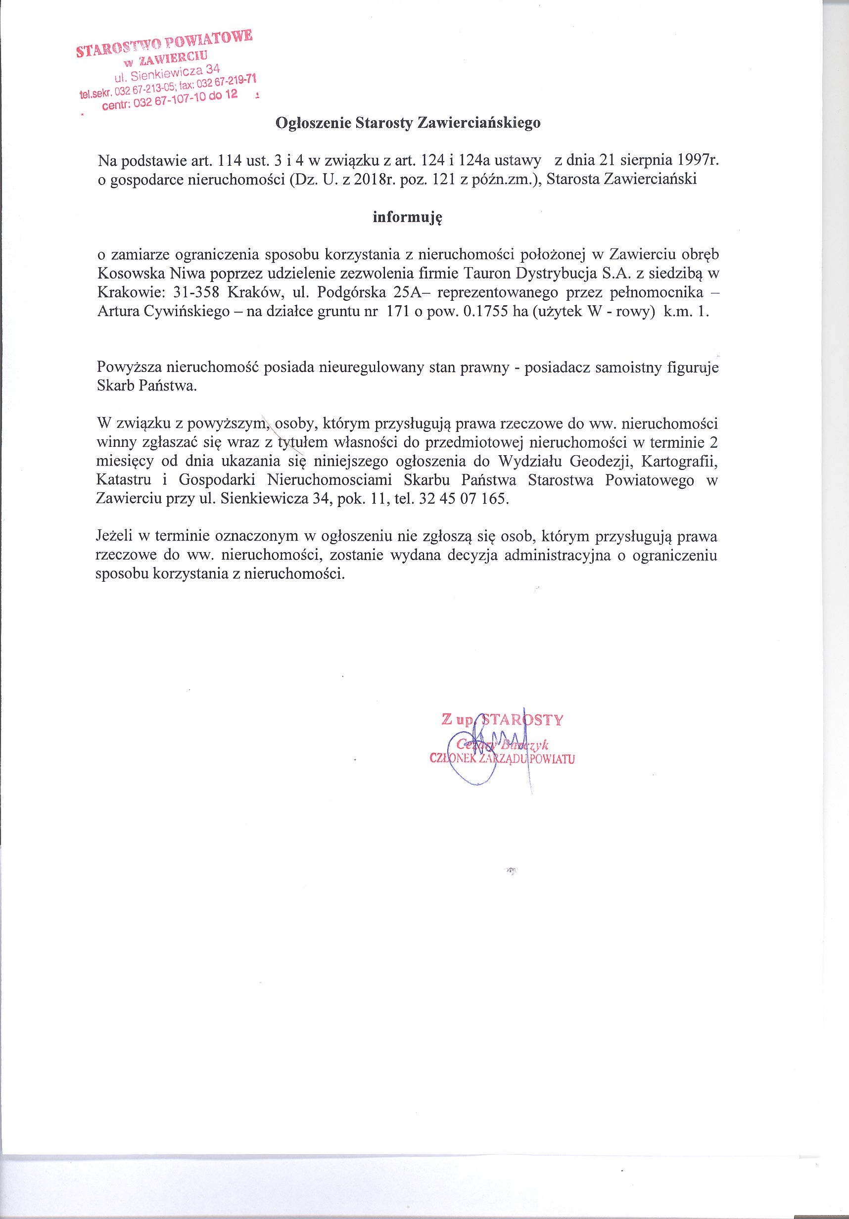 Ogłoszenie Starosty Zawierciańskiego o zamiarze ograniczenia sposobu korzystania z nieruchomości polożonej w Zawierciu obręb Kosowska Niwa dz. nr 171 o pow. 0,1755 ha k.m. 1.