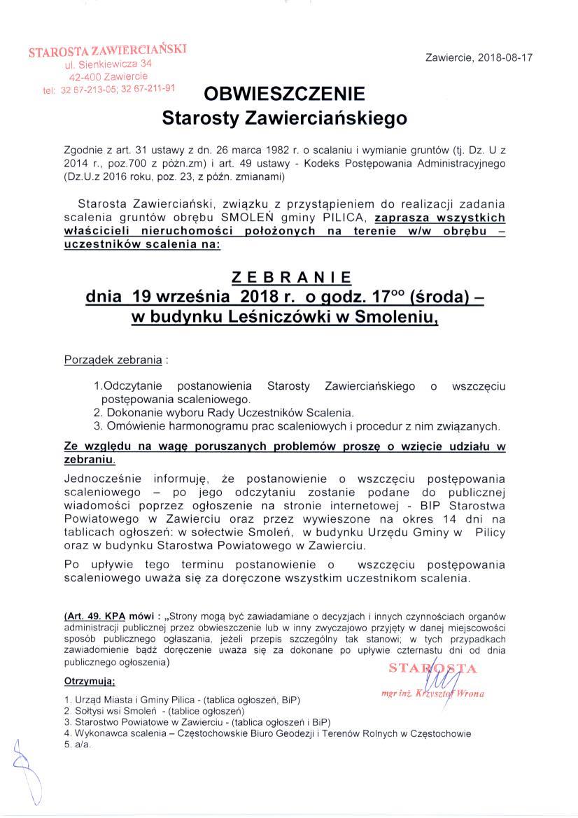 Obwieszczenie Starosty Zawierciańskiego w sprawie spotkania dot. scalenia gruntów obręb Smoleń