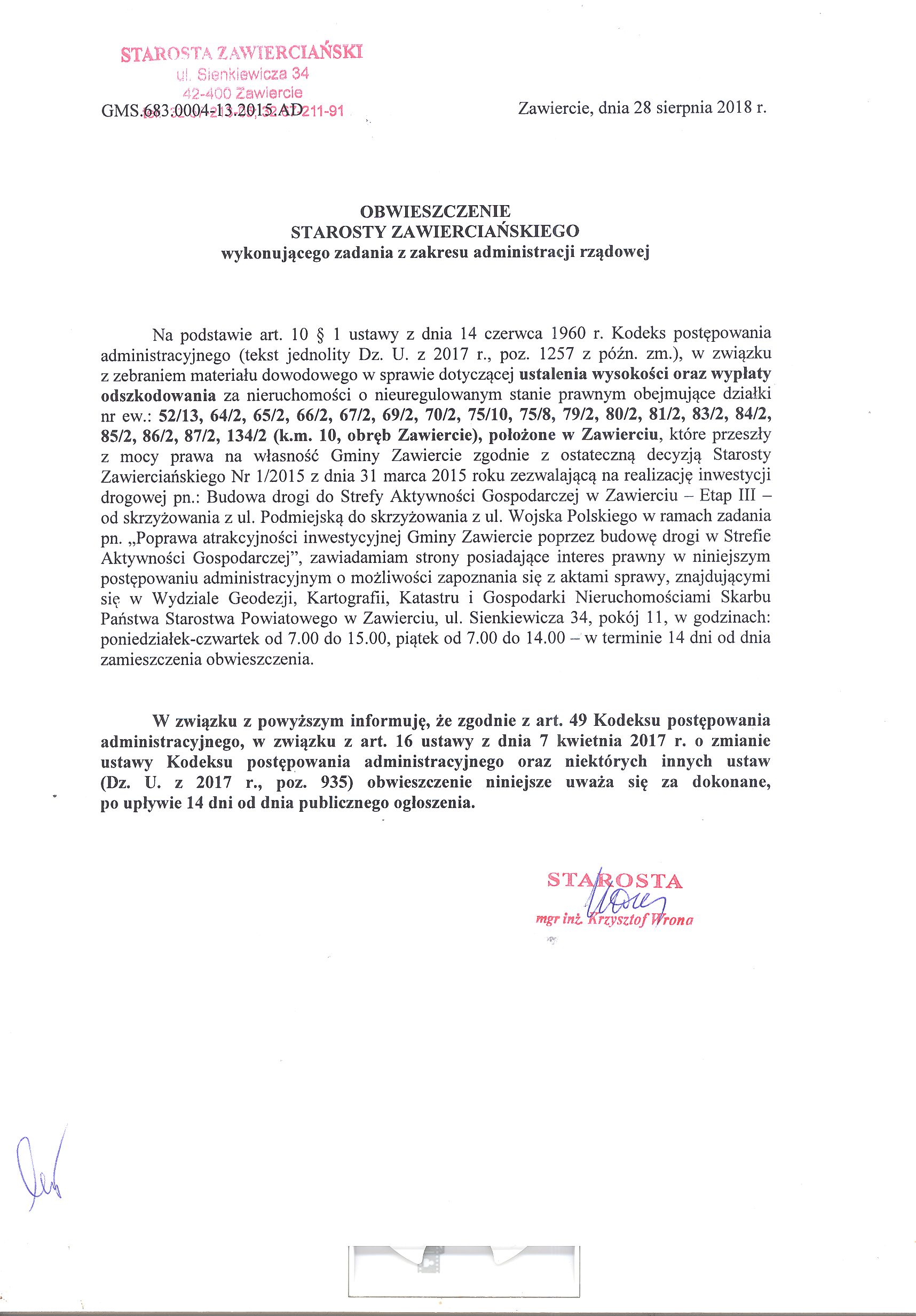 Obwieszcenie Starosty Zawierciańskiego w związku z zebraniem materiału dowodowego w sprawie dotyczacej ustalenia oraz wypłaty odszkodowania za nieruchomości o nieuregulowanym stanie prawnym obejmujące działki nr ew. : 52/13, 64/2, 65/2, 66/2, 67/2, 69/2, 70/2, 75/10, 75/8, 79/2, 80/2, 81/2, 83/2, 84/2, 85/2, 86/2, 87/2, 134/2 (k.m. 10, obręb Zawiercie), położone w Zawierciu, zajęte pod drogę publiczną.