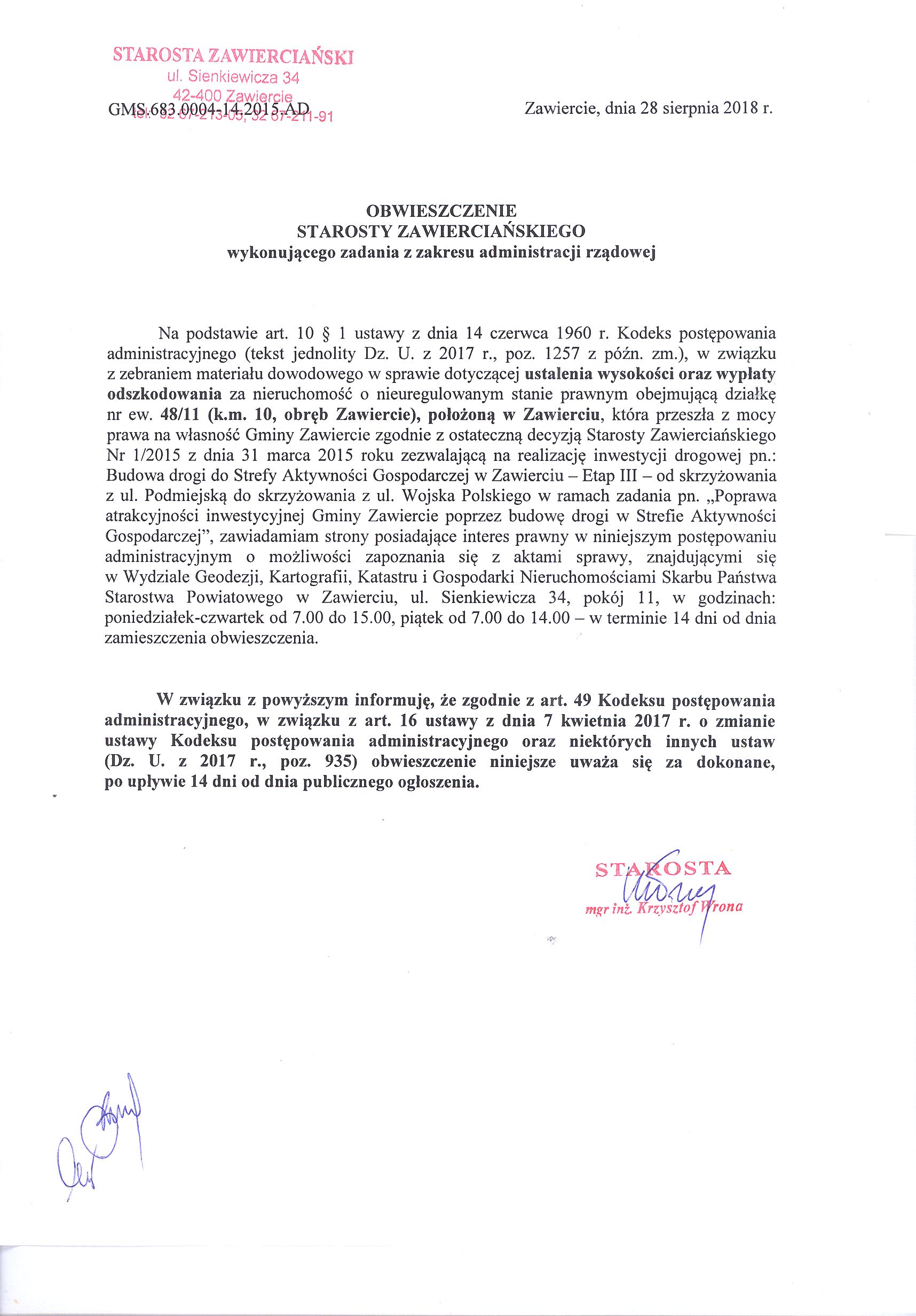 Obwieszczenie Starosty Zawierciańskiego w związku z zebraniem materiału dowodowego w sprawie dotyczącej ustalenia wysokości oraz wypłaty odszkodowania za nieruchomość o nieuregulowanym stanie prawnym obejmującą działkę nr ew. 48/11 (k.m. 10, obręb Zawiercie), położoną w Zawierciu, która została zajęta pod drogę publiczną.