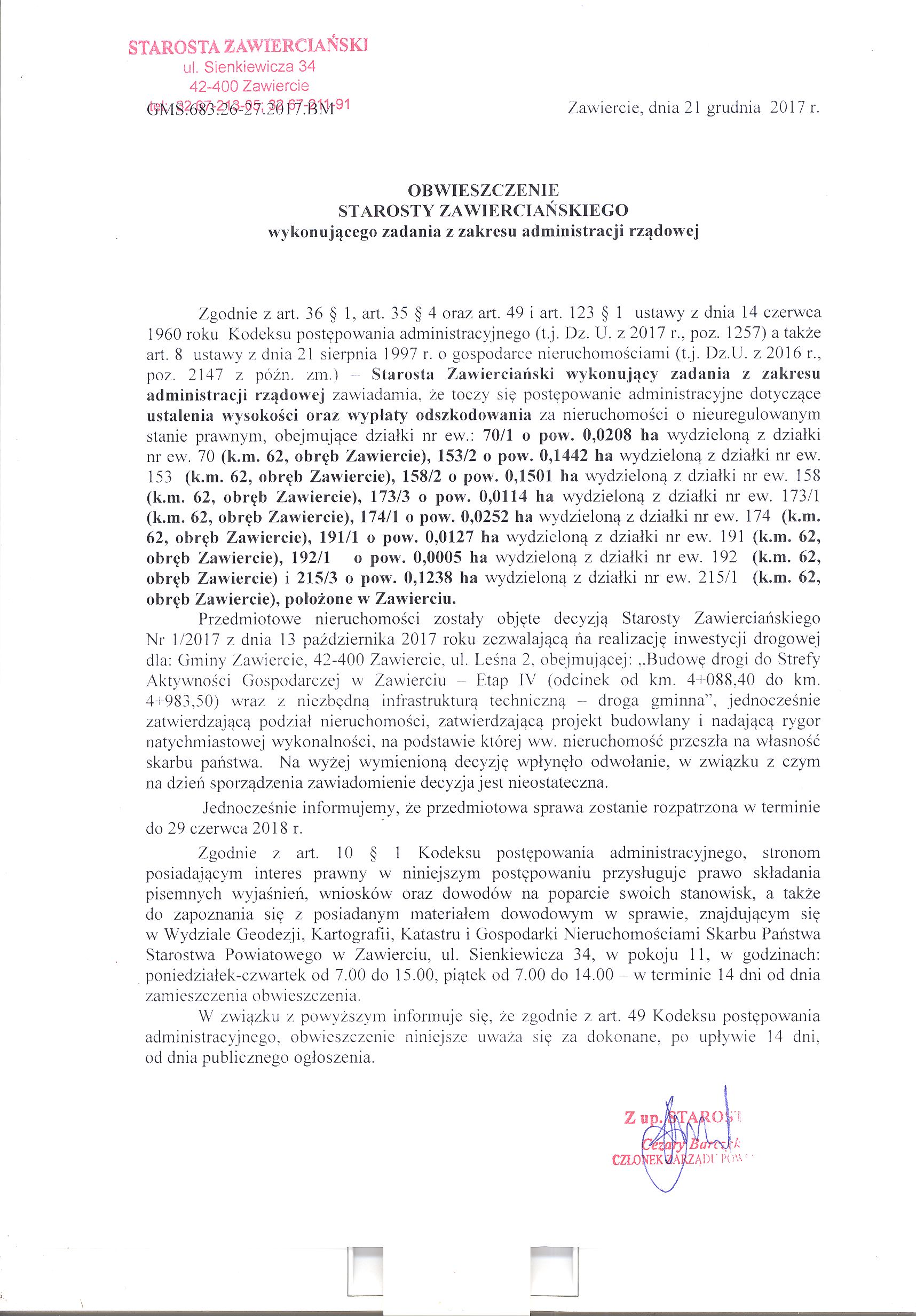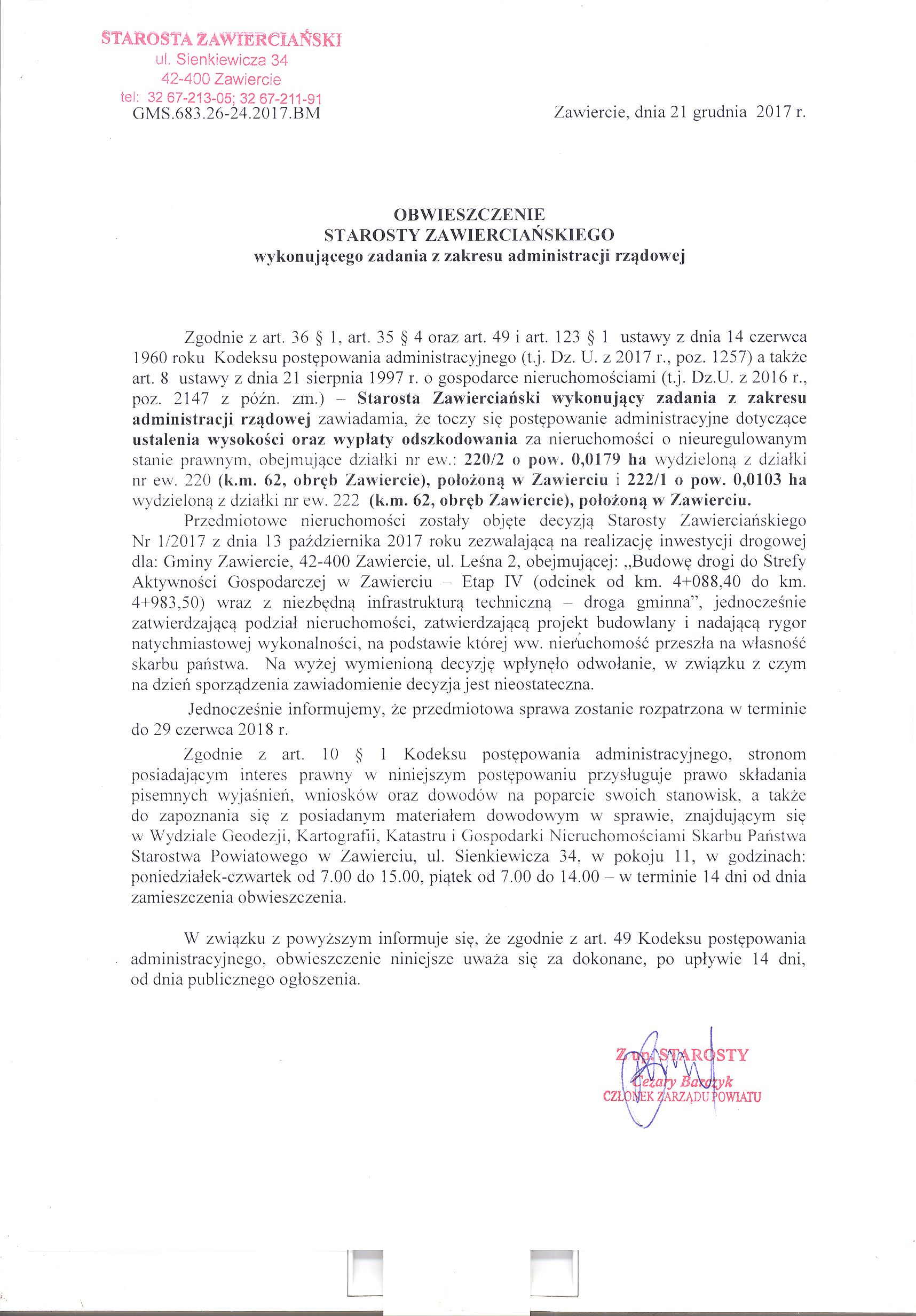 Obwieszczenie Starosty Zawierciańskiego w sprawie wszczęcia z urzędu postępowania administracyjnego dot. ustalenia wysokości oraz wypłaty odszkodowania za działki o nieuregulowanym stanie prawnym nr ew. : 220/2 o pow. 0,0179 ha i 222/1 o pow. 0,0103 ha (k.m. 62, obręb Zawiercie), położone w Zawierciu, zajęte pod drogę publiczną.