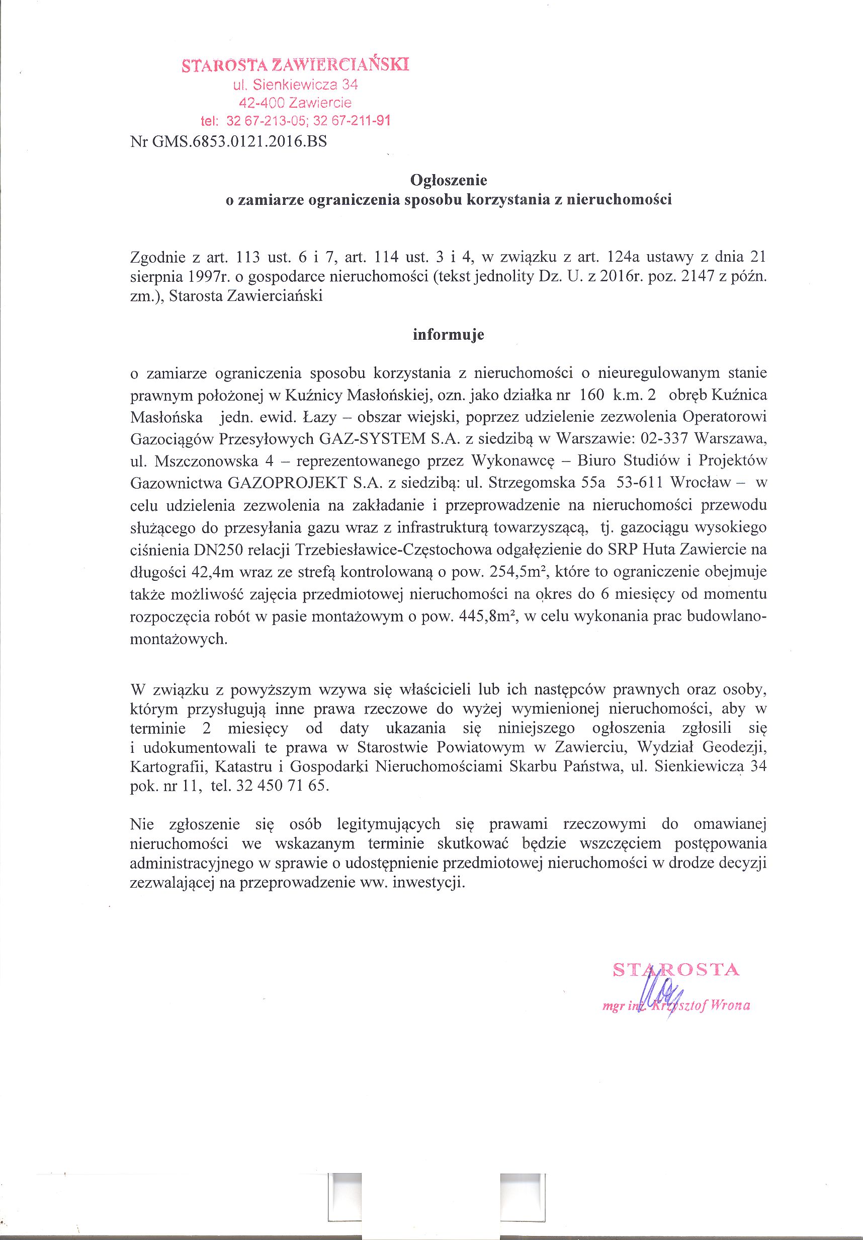 Ogłoszenie o zamiarze ograniczenia sposobu korzystania z nieruchomości. Nr GMS.6853.0121.2016.BS