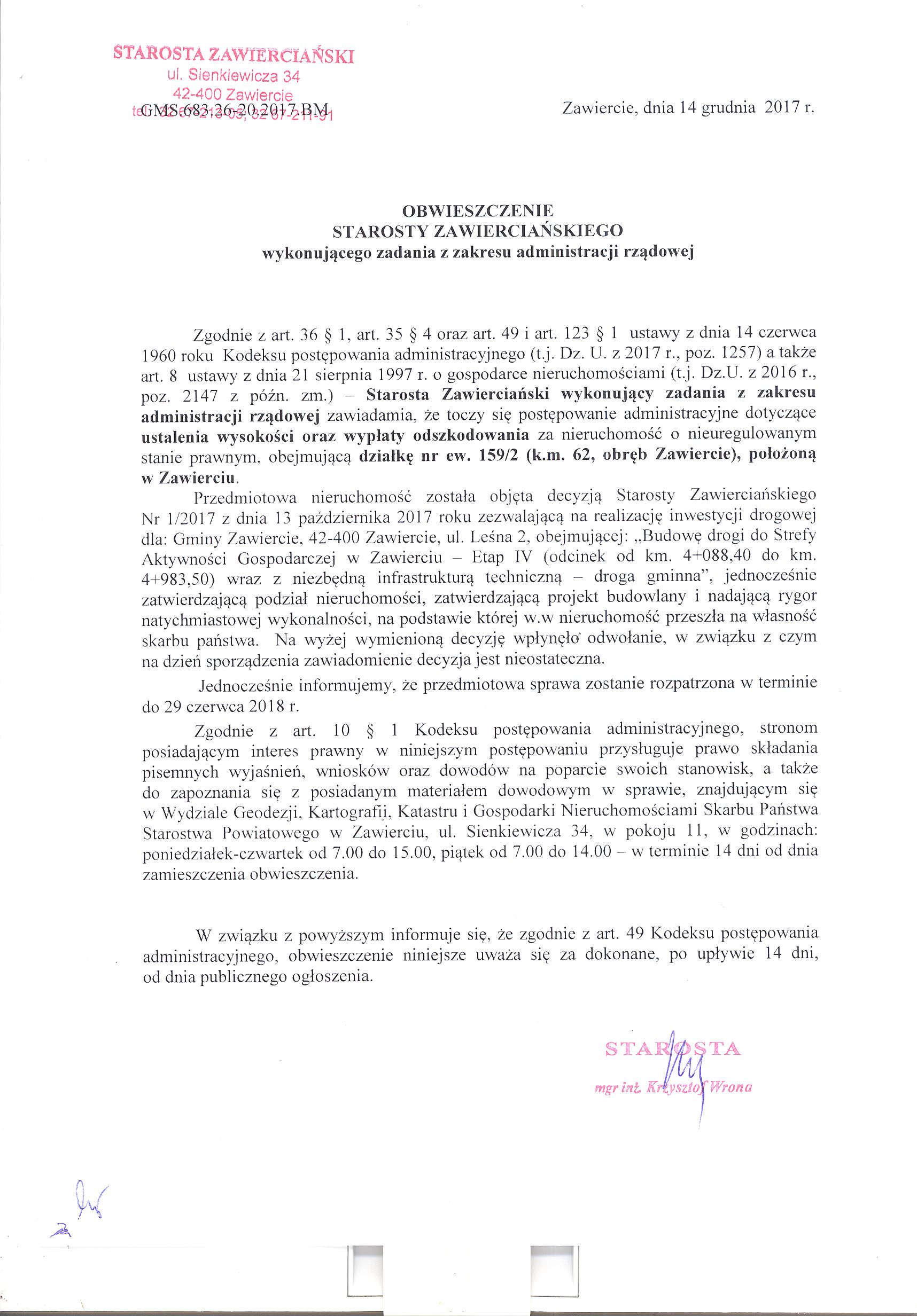 Zawiadomienie o wznowieniu/wyznaczeniu punktów granicznych - obręb Przyłęk działki nr 405/1,405/2 Km 1