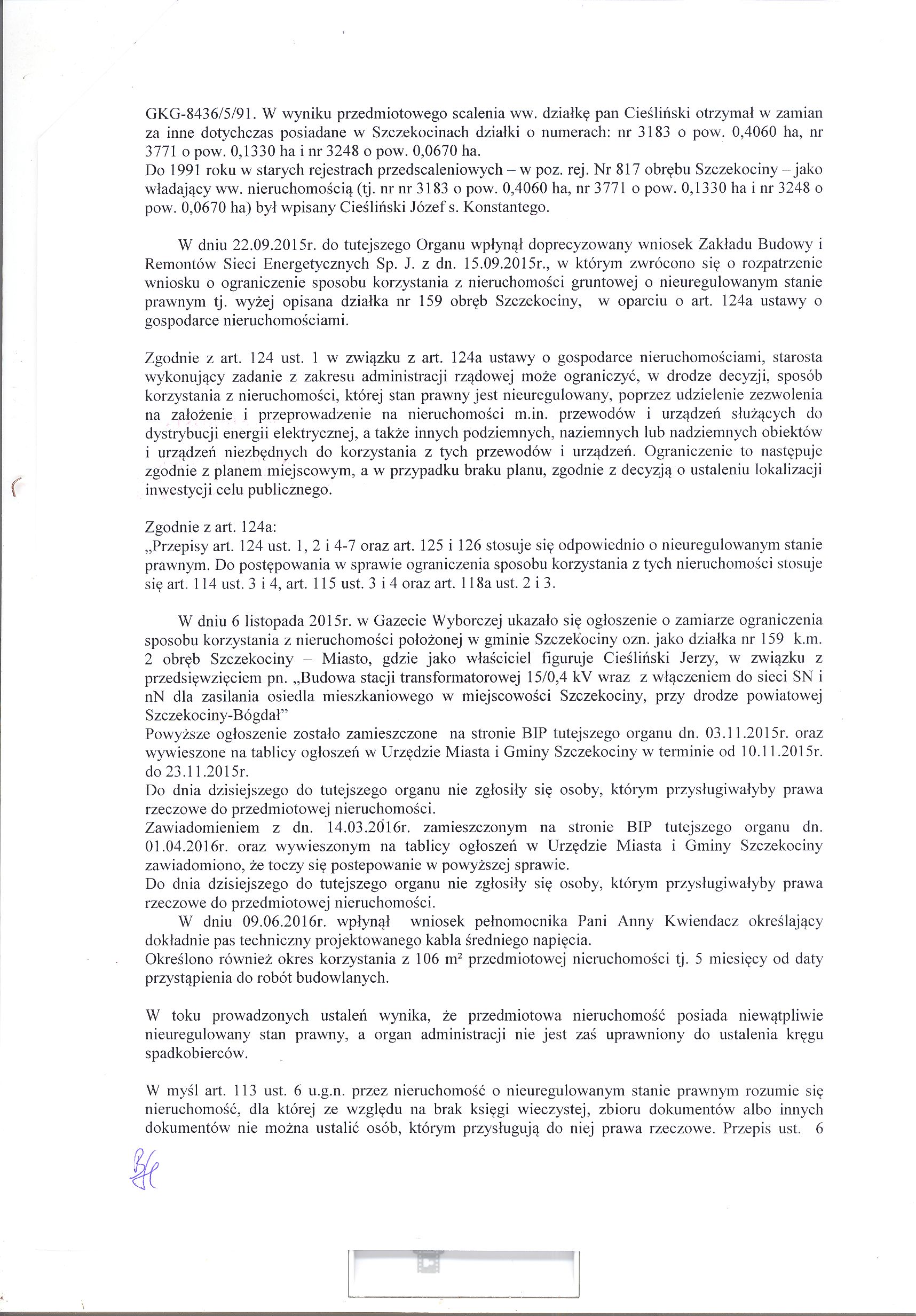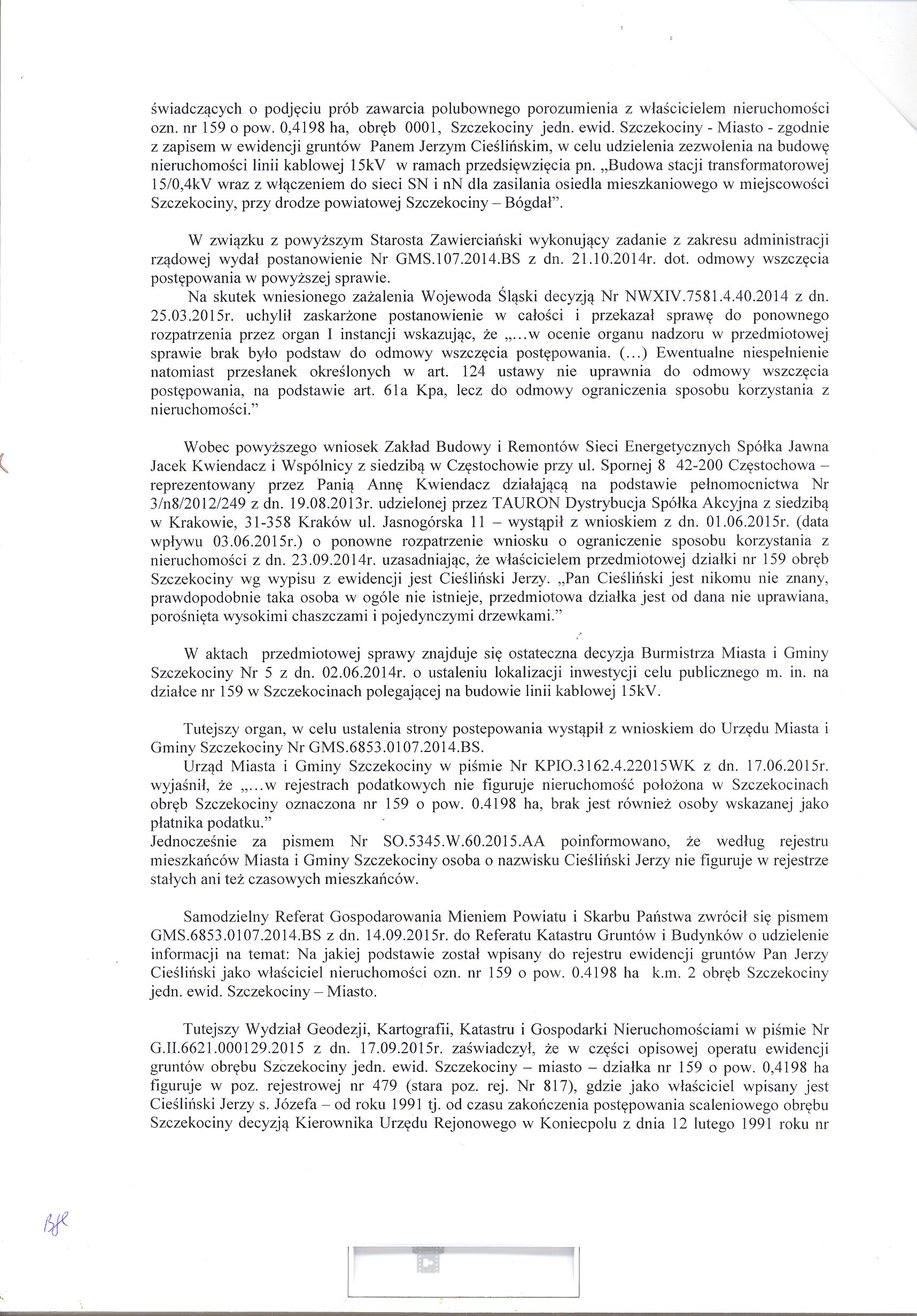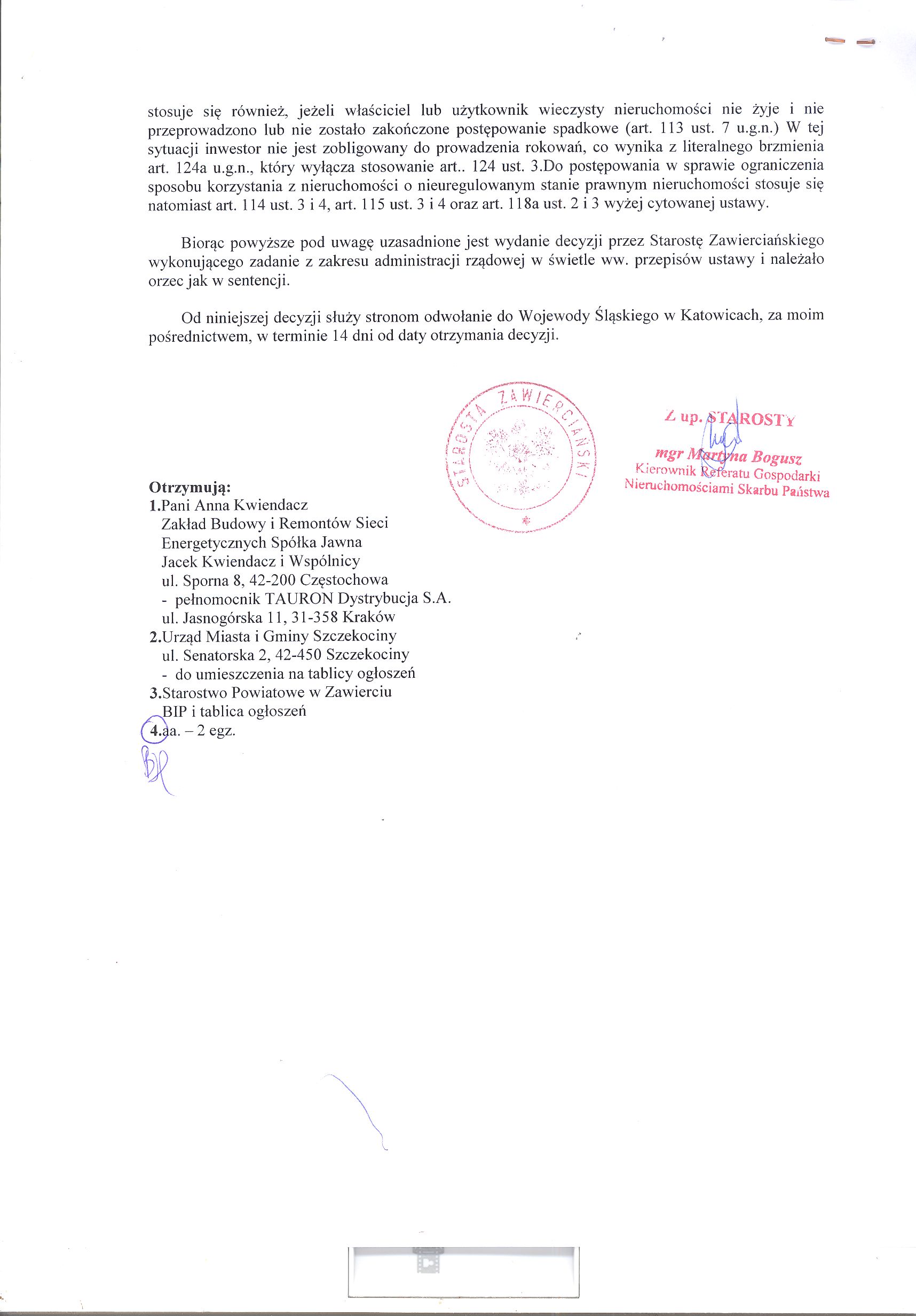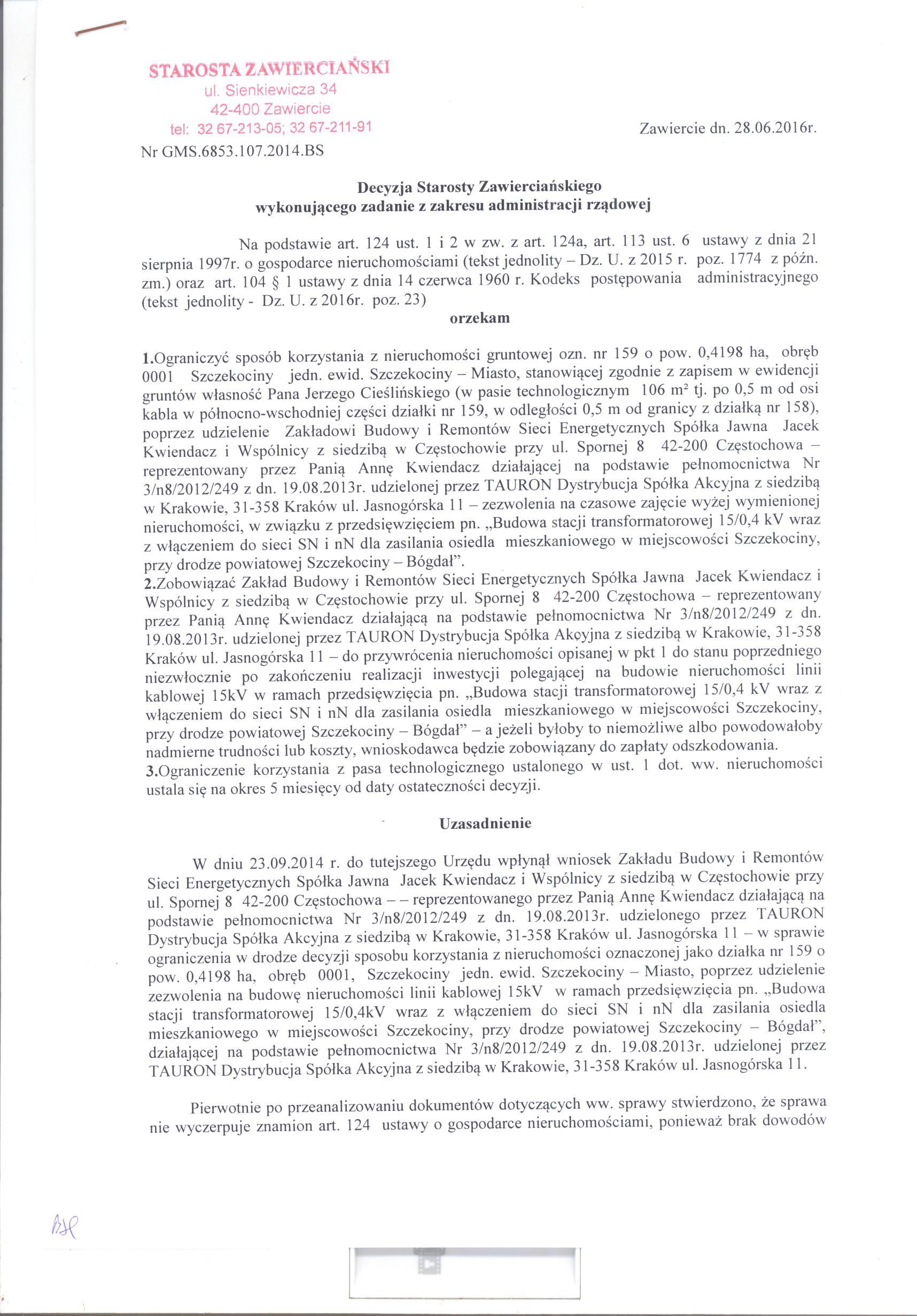 Decyzja Starosty Zawierciańskiego z dnia 28.06.2016r. o ograniczeniu sposobu korzystania z nieruchomości położonej w Szczekocinach