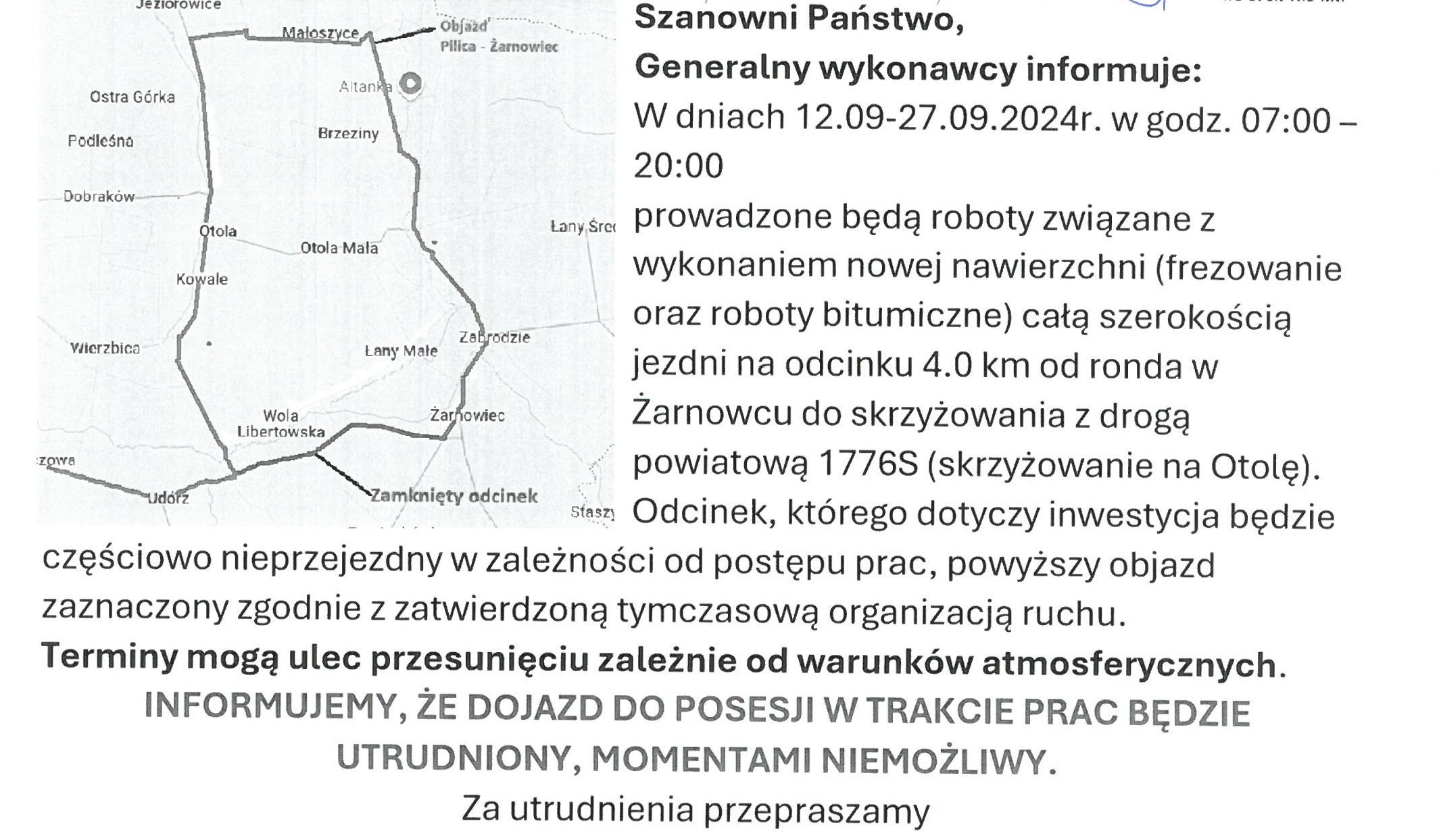 Utrudnienia w ruchu na drodze Żarnowiec - Otola