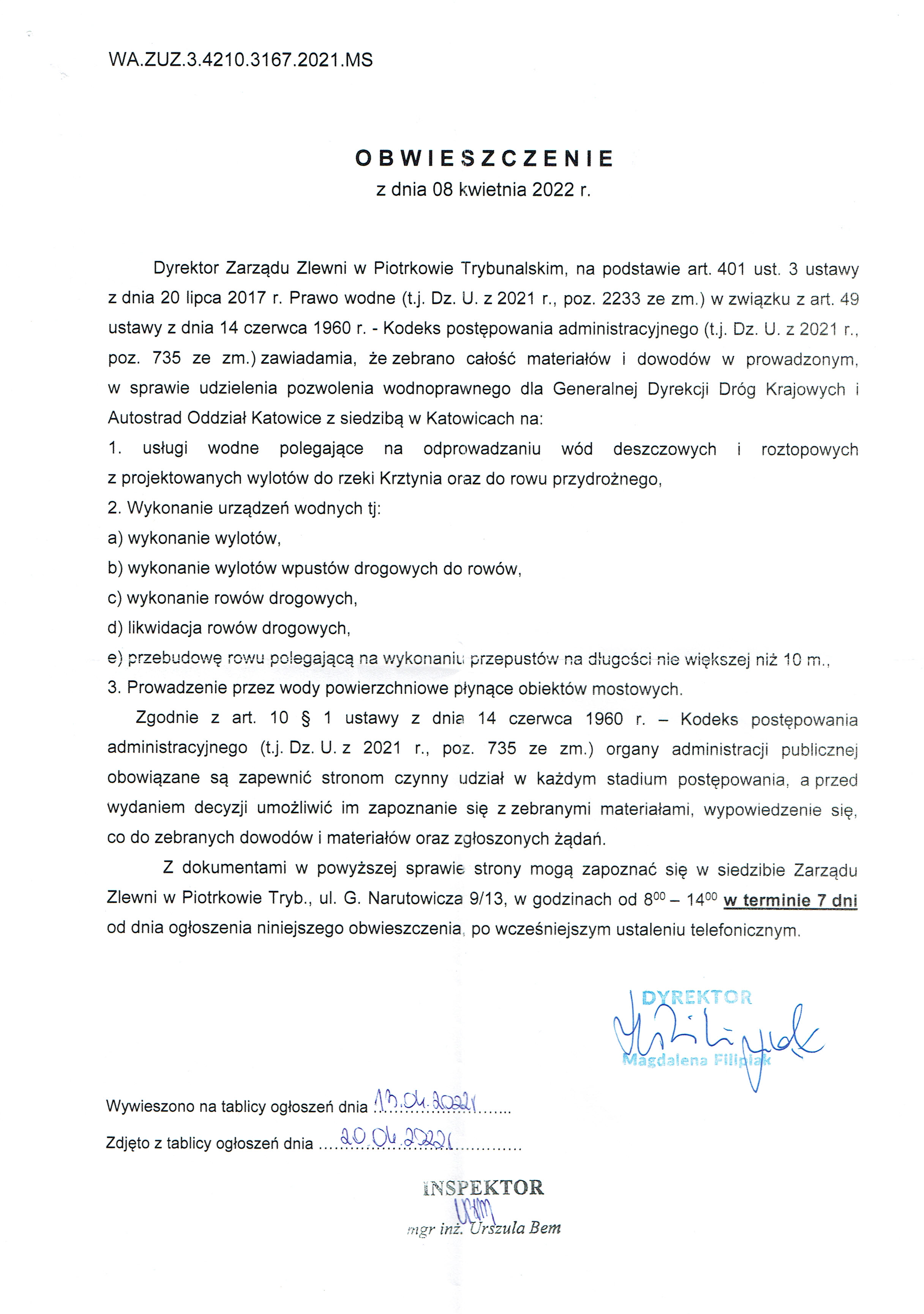 Obwieszczenie Dyrektor Zarządu Zlewni w Piotrkowie Trybunalskim z dnia 08.04.2022 r.